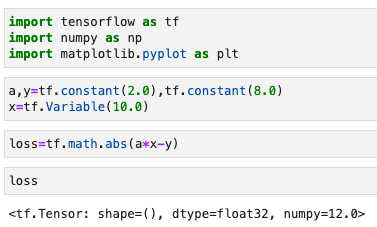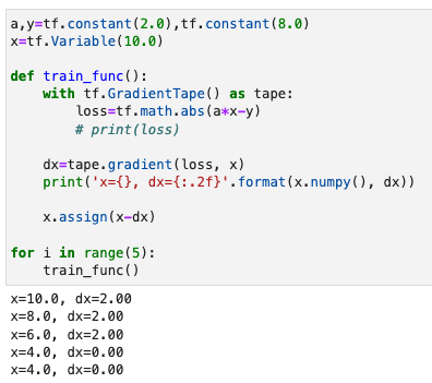 ์์ (1)๋ฒ์์ ์๊ฐํ 8.0=2.0*x์ ๋ฐฉ์ ์์์๋ ๋ณ์ x-4.0์ด ๋ฉ๋๋ค. Tensorflow์ GradientTape()์ tape.gradient()๋ฅผ ์ฌ์ฉํ์ฌ ๋ฌธ์ ๋ฅผ ํด๊ฒฐํด ๋ณด๊ฒ ์ต๋๋ค.