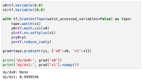 ์๋์ ์์์์๋ x0, x1 ๋ ๊ฐ์ tf.Variable ๋ชจ๋๋ฅผ watch_accessed_variables=False๋ก ๋นํ์ฑํํด๋๊ณ , GradientTape.watch(x1)๋ก x1๋ณ์๋ง ํ ์ดํ์ ๊ธฐ๋กํด์ ์๋ ๋ฏธ๋ถ์ ํฉ๋๋ค.