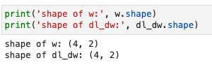 Targetr์ ๋ํ Source์ ๋ฏธ๋ถ ๊ฒฐ๊ณผ๋ Source์ ํ์(shape)์ ๋ฐ๋ฆ ๋๋ค. ๊ฐ๋ น, ์์ ์์์๋ ์์คํจ์(Loss)์ ๋ํ ๊ฐ์ค์น(w)์ ๋ฏธ๋ถ(derivative of loss with respect to weight)์ ๊ฒฐ๊ณผ๋ Source์ ํด๋นํ๋ ๊ฐ์ค์น(w)์ ํ์์ ๋ฐ๋ผ์ (4, 2)๊ฐ ๋ฉ๋๋ค. (ํด๋น ์์น์ ๊ฐ์ค์น์ ๋ํด์ ํธ๋ฏธ๋ถํ ๊ฒฐ๊ณผ)